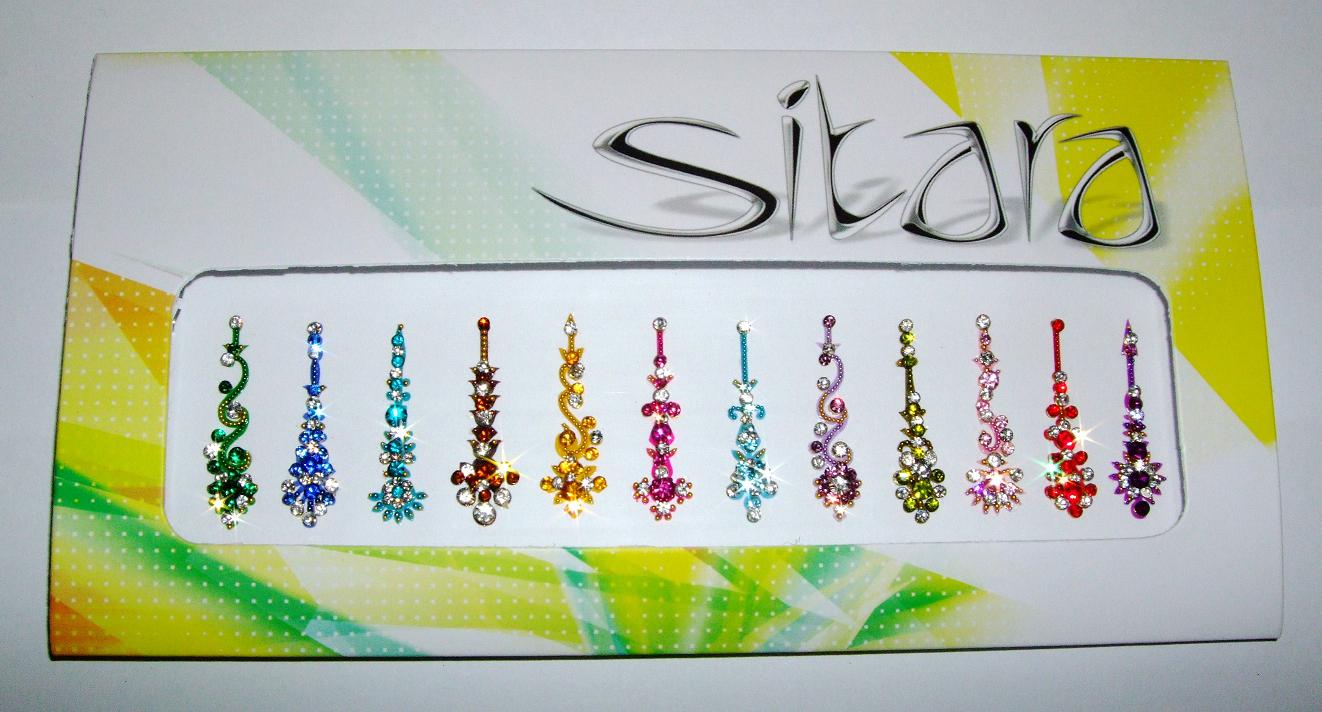 The pack includes 12 glistening long bindis in different colours and modern chic designs..