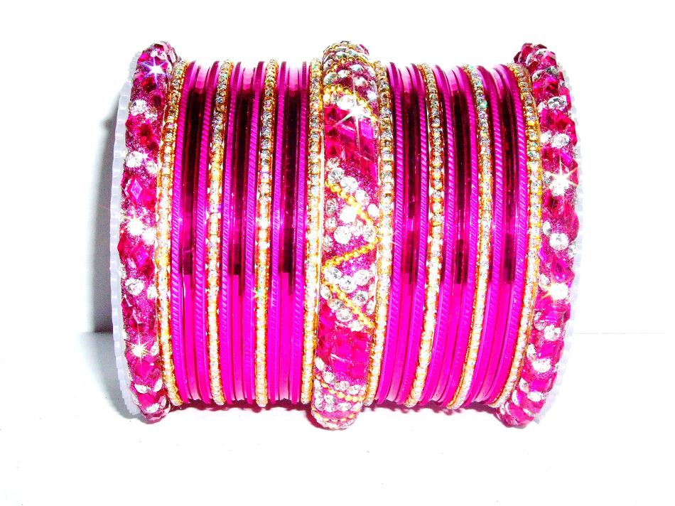 Rani Pink & Gold indian fashion bangles incorporating the finest Clear stonework