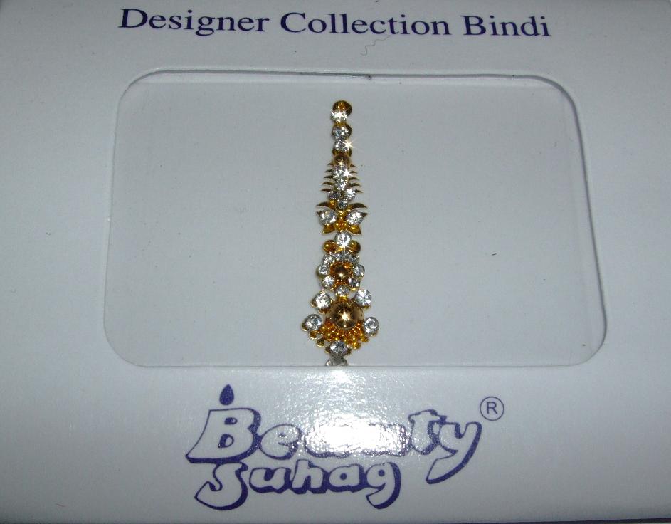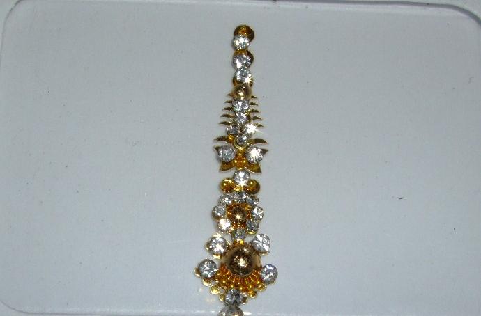 Accessorize with this beautiful gold indian fashion bindi featuring glistening clear stones/crystals