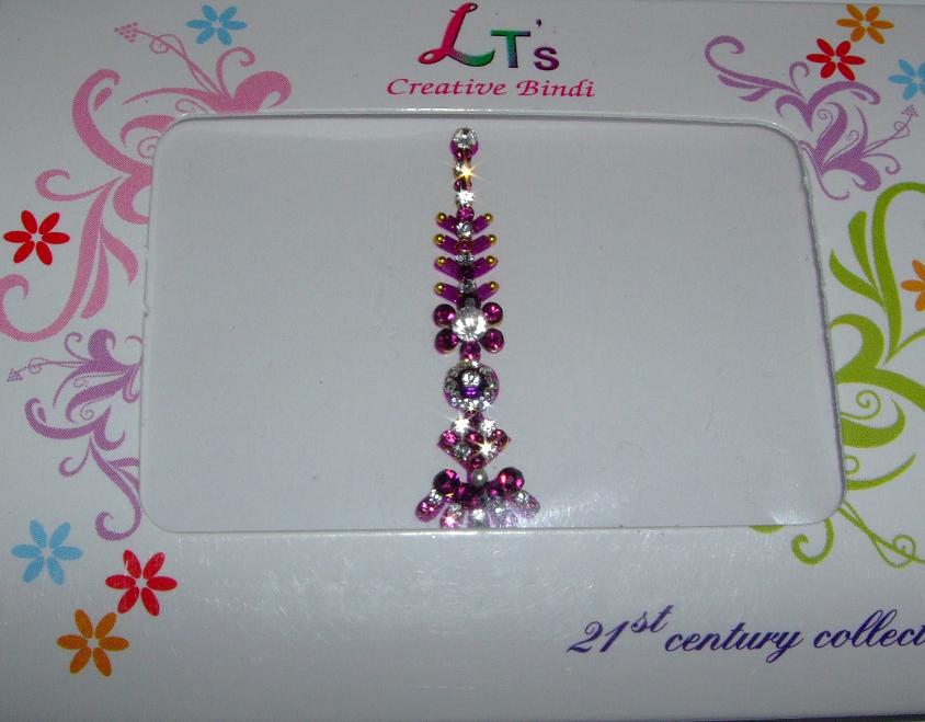 Accessorize with this long indian fashion bindi featuring glistening purple & clear stones/crystals