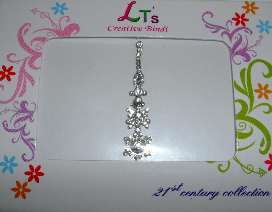Accessorize with this beautiful long silver bindi featuring glistening clear stones/crystals